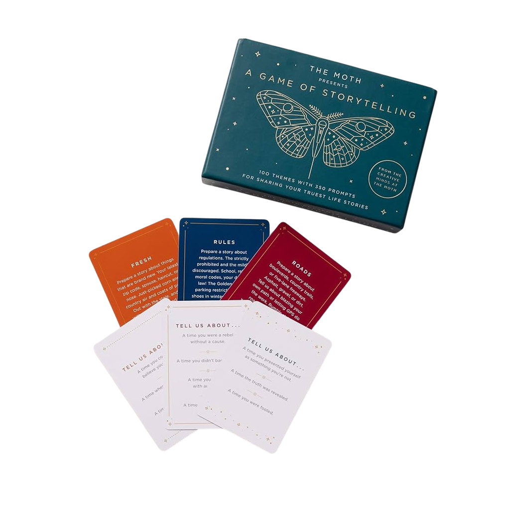 The Moth Presents: A Game of Storytelling. Players draw a card, pick a prompt, and tell a real story from their own lives. Perfect for the whole family. Get it here